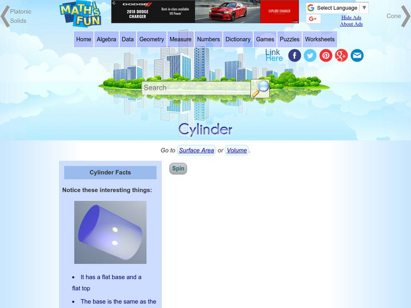 The resource investigates the cylinder. Students learn about surface area, volume, and different types of cylinders. Definitions, animations, formulas, and practice questions are included.
