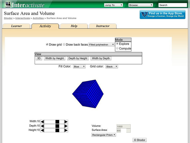 This is an interactive site that enables the viewer to input different measurements in order to learn about surface area and volume for a rectangular prism and a triangular prism.