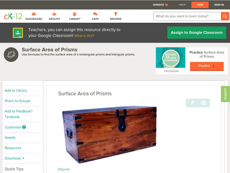 [Free Registration/Login may be required to access all resource tools.] Use a formula and given information to calculate the surface area of different prisms.
