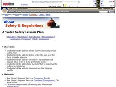 Students examine water safety for the beach. They discuss the three safety rules, demonstrate various ways to rescue a person, participate in the stingray shuffle dance, and complete a crossword puzzle quiz.