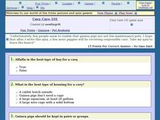 In this cavy care worksheet, students complete a ten question multiple choice online interactive quiz about details related to the care of guinea pigs. Prior knowledge is assumed.