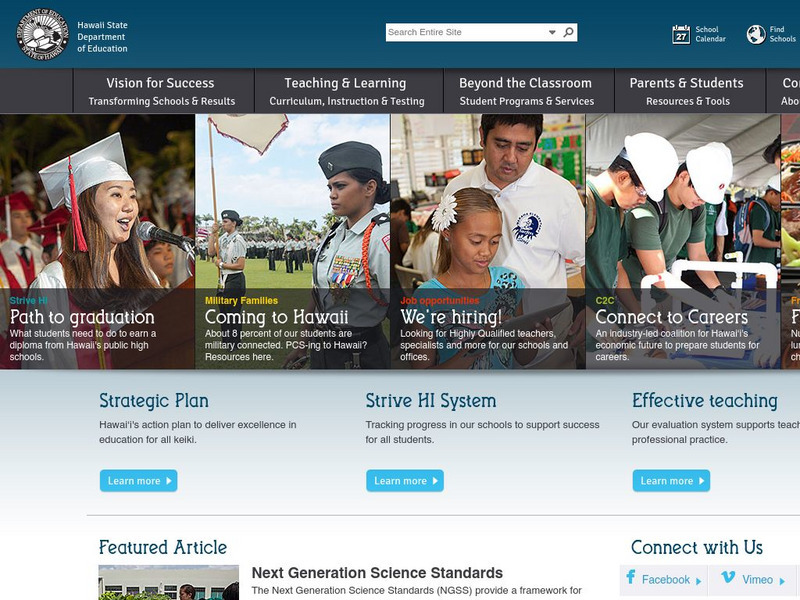 Plenty of information here at the Hawaii Department of Education to enlighten both teachers and parents. In addition to the expected links to such areas as test scores, school goals and philosophy, and job opportunities, you will find...
