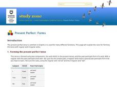 In this present perfect and past participle instructional activity, students read examples on how to write subjects into the present perfect and past participle form. Students also read about different verbs in those tenses. Click on...