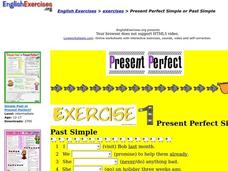 In this present perfect learning exercise, students fill in the blanks to sentences with simple or past tense forms of verbs by completing the sentences or choosing the correct word. Students complete 23 problems total.