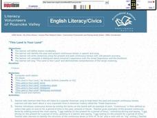 Students use a popular American song to learn the past and present continuous tenses. They complete a web quest about the song "This Land is Your Land" and discuss it.
