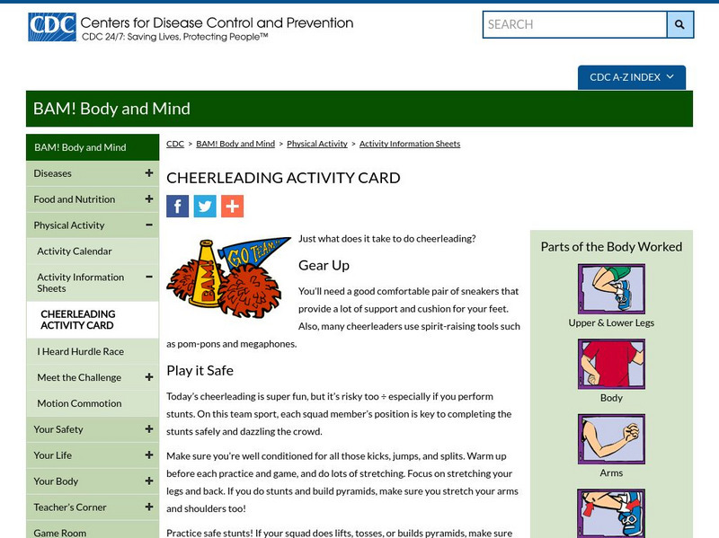 Here you can learn all about the sport of cheerleading! Find out what kind of equipment you will need to get started, how to play it safe, what kind of arm motions and jumps you will need to learn, and some fun facts!