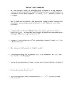 In this gas worksheet, students convert within units of pressure and temperature, they solve problems using the various gas laws, they explain concepts as they related to the kinetic molecular theory and they discuss details of a...
