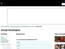 In this online interactive history quiz worksheet, students respond to 50 multiple choice questions about George Washington. Students may submit their answers to be scored.