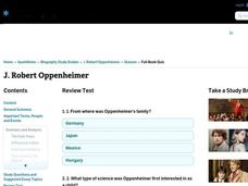 In this online interactive history quiz worksheet, students respond to 50 multiple choice questions about J. Robert Oppenheimer. Students may submit their answers to be scored.