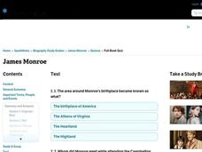 In this online interactive history quiz worksheet, students respond to 50 multiple choice questions about the accomplishments of James Monroe. Students may submit their answers to be scored.