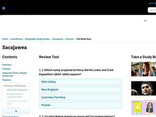 In this online interactive history quiz worksheet, students respond to 48 multiple choice questions about Sacajawea. Students may submit their answers to be scored.