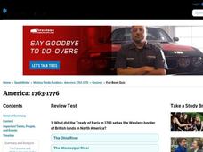 In this online interactive history quiz worksheet, learners respond to 50 multiple choice questions about colonial America. Students may submit their answers to be scored.
