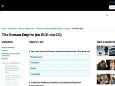 In this online interactive history quiz worksheet, students respond to 50 multiple choice questions about the Roman Empire. Students may submit their answers to be scored.