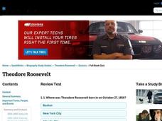 In this online interactive history quiz worksheet, students respond to 50 multiple choice questions about the accomplishments of Theodore Roosevelt. Students may submit their answers to be scored.