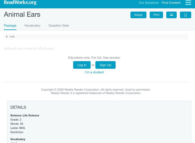 [Free Registration/Login Required] An informational text about four animals that have very different types of ears. A question sheet is available to help students build skills in reading comprehension.