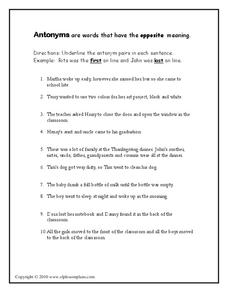 For this antonym worksheet, students underline antonym pairs in sentences. One example is completed for students; a reference website is included.