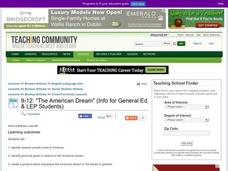 Learners explore, analyze and study novel reflections on the American dream that the United States has held the promise of unlimited possibilities. They describe the concept of the American dream, listen to and record real stories of...
