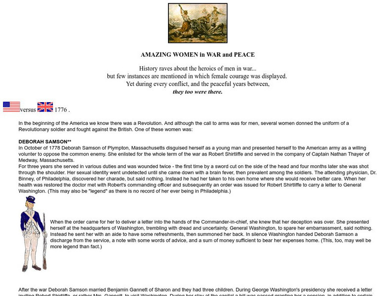 A fairly detailed account of the life and times of Deborah Sampson, this page also accounts for several other revolutionary war women, including Rachel and Grace Martin, Anna Warner, Margaret Corbin, Angelica Vrooman, Mary Hagidorn, Anne...