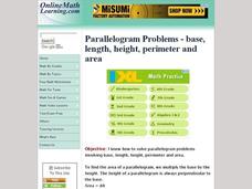 Here is an area and perimeter worksheet in which learners find each for a set of 60 given parallelograms. Problems appear six per page, on 10 pages plus answers. A website reference for additional resources is provided.