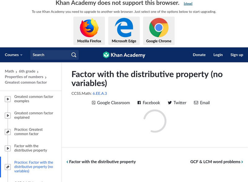 Practice applying the distributive property to factor numerical expressions (no variables). Students receive immediate feedback and have the opportunity to try questions repeatedly, watch a video or receive hints.