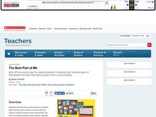 After listening to the story, The Best Part of Me, learners will identify a positive physical feature of themselves, and create a descriptive poem about their favorite feature. Photographs are taken, and a nice final draft of the poem is...