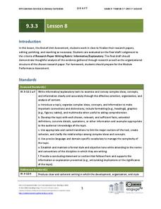 Dictionaries, thesauruses, word walls, oh my! Pupils use several resources to revise their position papers to include appropriate vocabulary. Then, after peer editing, scholars write the final drafts of their essays and self-assess using...