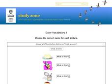 In this dairy vocabulary worksheet, students look at a picture, identify the dairy product and select the correct word from a pull-down menu.