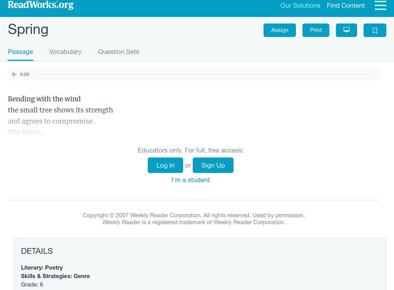 [Free Registration/Login Required] Four three-lined poems describing the spring season. A question sheet is available to help students build skills in reading comprehension.