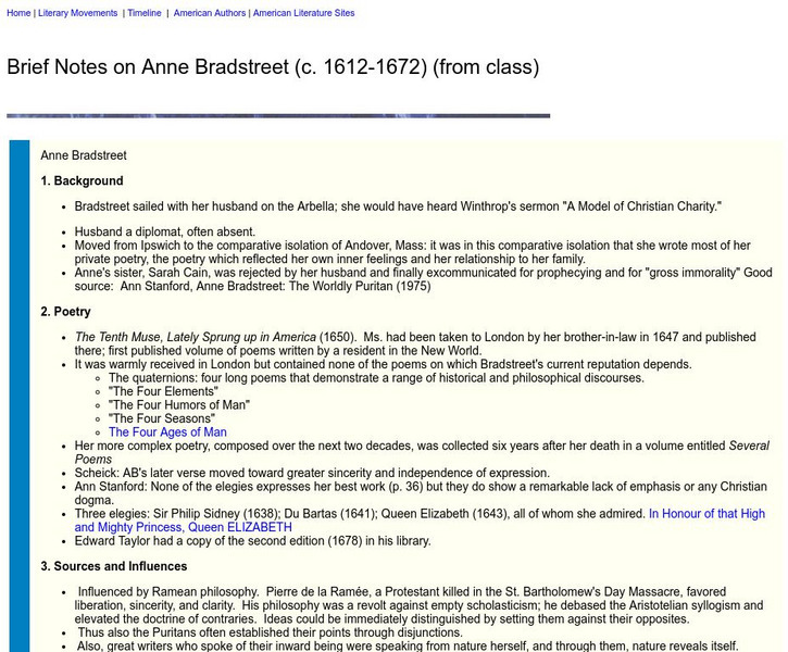 Washington State University: American Authors: Notes on Anne Bradstreet