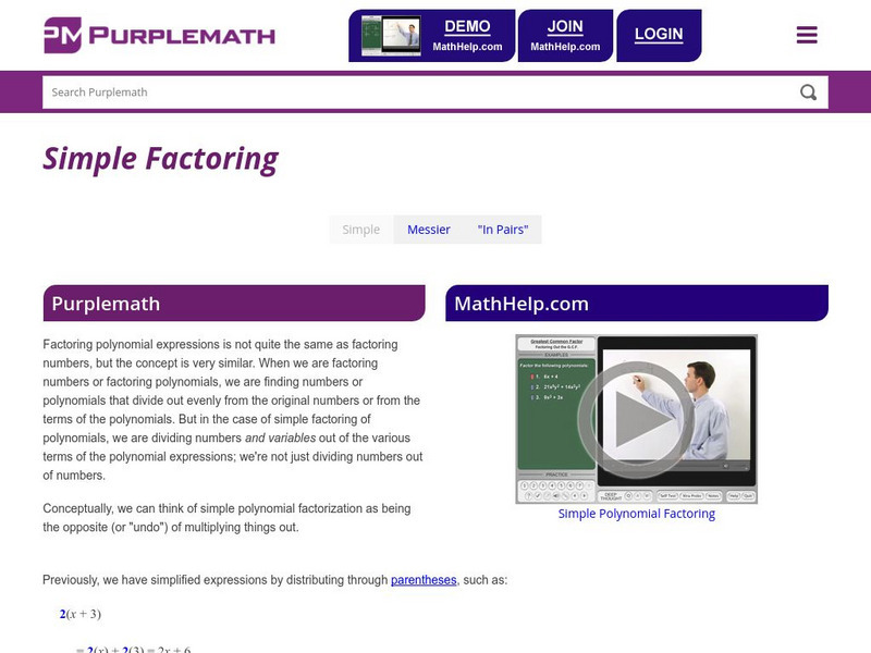 Demonstrates how to factor simple polynomial expressions such as "2x + 6".