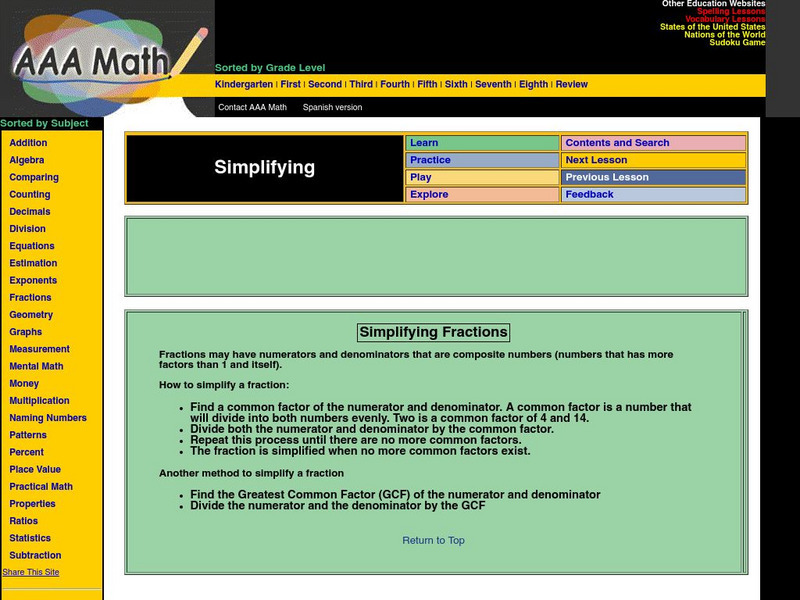 This site explains how to simplify fractions, then offers problems and games to practice this skill.