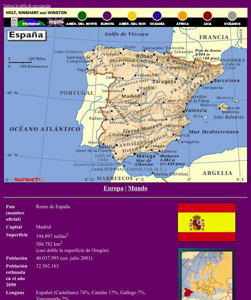 This site has a map of Spain in Spanish, with informational data also presented in Spanish about the country. Land mass, population, life expectancy, literacy, industry, agriculture, minerals, and resources are among the topics...