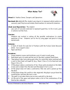 Students investigate the concept of ten and how it is part of the real number system. They find the quantity of ten using as many combinations as possible. They can count using manipulatives, write on paper, or by doing mental math.