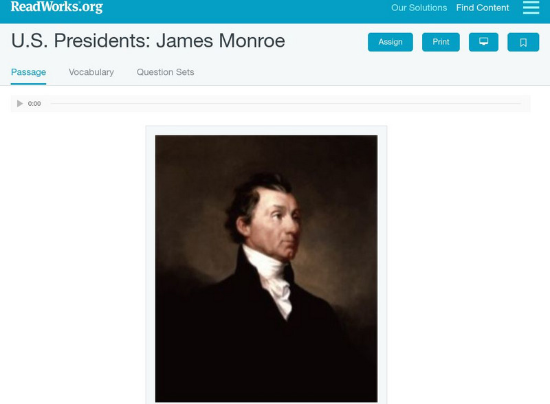 [Free Registration/Login Required] An informational text about James Monroe, the fifth President of the United States. A question sheet is available to help students build skills in reading comprehension.