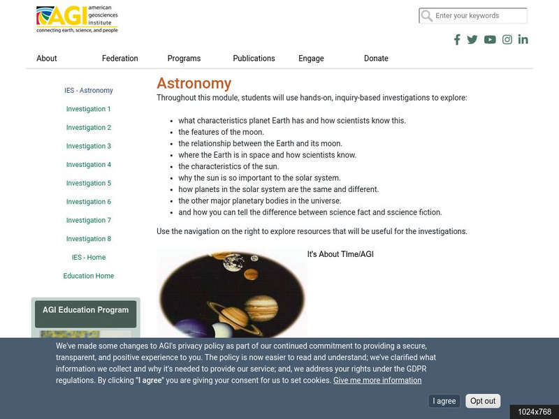 Eight hands-on lessons module in which students explore the characteristics of planet Earth, its moons, the sun, the solar system, planets, and the difference between science fact and science fiction.