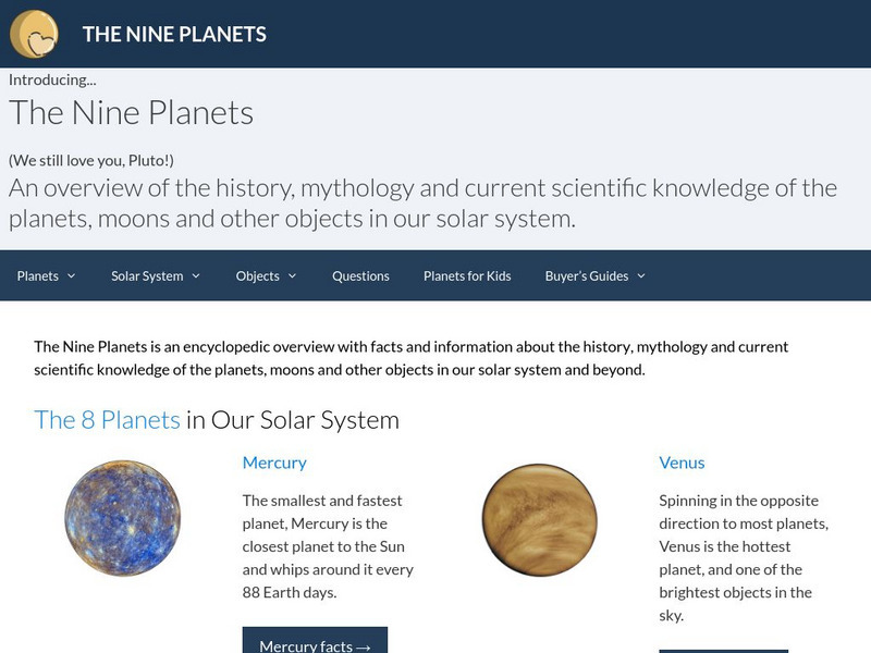 This stunning site on the solar system gives a great overview of the planets and our sun. Learn about each object's size, vital statistics, and moons. Then go on for a more in depth look at these objects in the column on the left.