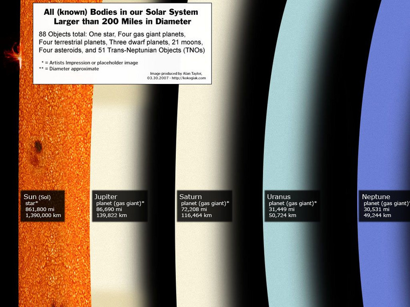How big is the Earth compared to the Sun? Is Mars bigger than the Moon? Seeing all bodies in the solar system larger than 200 miles in diameter side by side provides an excellent comparison and an interesting perspective.