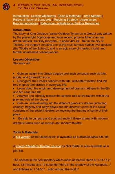 One of the main objectives for this lesson is for students to gain an insight into Greek tragedy. This site features a detailed lesson plan.