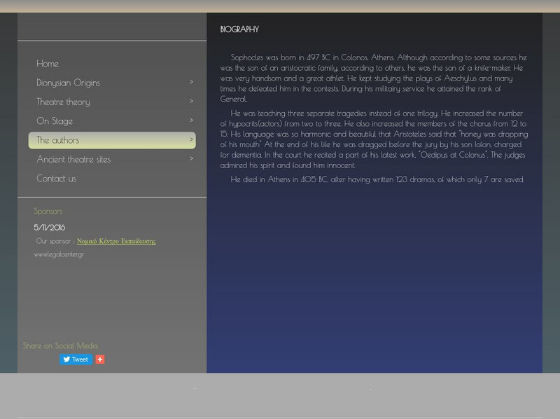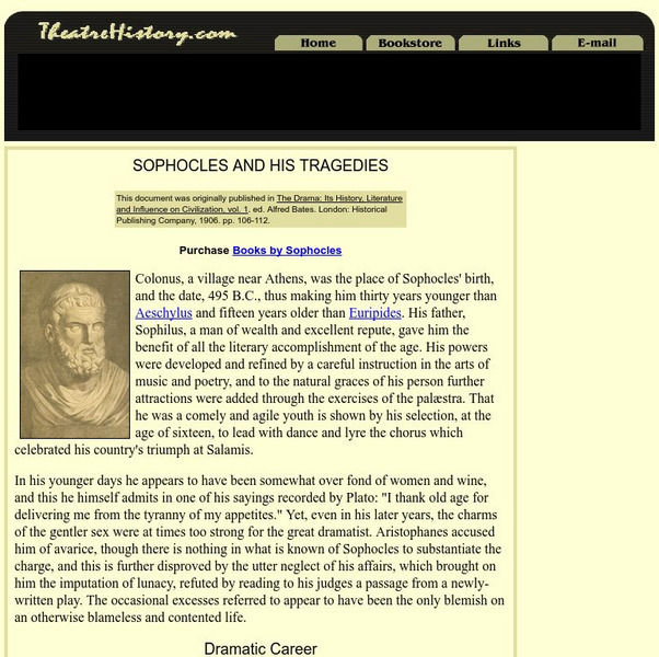 This site provides a complete biography of Sophocles reprinted from a drama history book. Includes his innovations in ancient theater and his achievements as an artist.