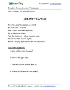 Four short answer questions make up a worksheet created to reinforce reading comprehension skills. Scholars read a brief passage about two boys picking apples then recall the story's details answering who, what, where, and how questions.