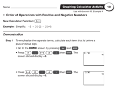 In this graphing calculator worksheet for the TI-83 calculator, middle schoolers first observe a demonstration for calculating negative numbers. Next, students use their graphing calculator to answer 6 thoughtful T/F and short answer...