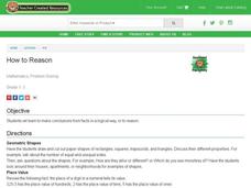Students practice their logical thinking skills. In this reasoning lesson plan, students complete tasks involving geometric shapes, place value, and odd/even numbers.