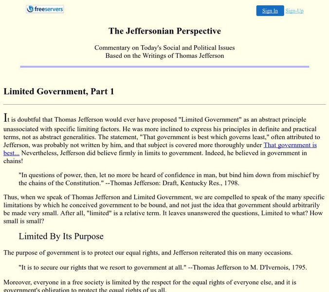 It is doubtful that Thomas Jefferson would ever have proposed "Limited Government" as an abstract principle unassociated with specific limiting factors. He was more inclined to express his principles in definite and practical terms, not...
