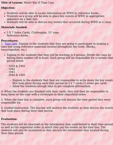 Students locate information on WWII in reference books. They as a group place key events of WWII in appropriate sequence on a time line and discuss key events that occurred during WWII as a class.