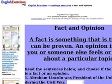 In this fact or opinion instructional activity, learners read sentences and choose whether the sentences are fact or opinion. Students complete 9 problems.