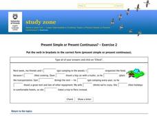 In this online/interactive verbs worksheet, students read and complete sentences with the correct forms of present simple or present continuous verbs. Students fill in 11 blanks.