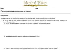 In this earthquakes worksheet, students look at maps of earthquake patterns and answer short answer questions. Students answer 12 questions.