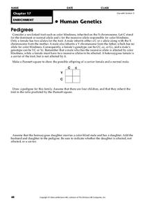 In this biology instructional activity, 9th graders create a Punnett square to show the possible offspring of a carrier female and a normal male for color blindness. Then they draw a pedigree for the family and indicate whether the...