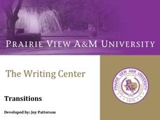 Students explore the importance of using transitional phrases in their writing. They discuss why transitions are important to their writing and various types of transitions that they can use. Students practice using transitions in their...