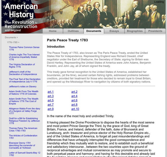 Content includes the full text of the Paris Peace Treaty 1783 which ended the United States War for Independence.